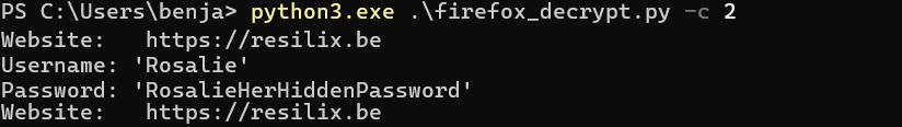 A frequently asked question is how secure another browser, or Firefox, is in comparison. These browsers are equally vulnerable and can have their credentials dumped if an attacker has control over the end user’s computer. As demonstrated in the screenshot below, Firefox passwords are dumped using the tool firefox_decrypt.py.