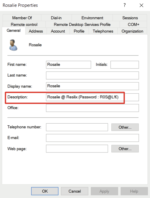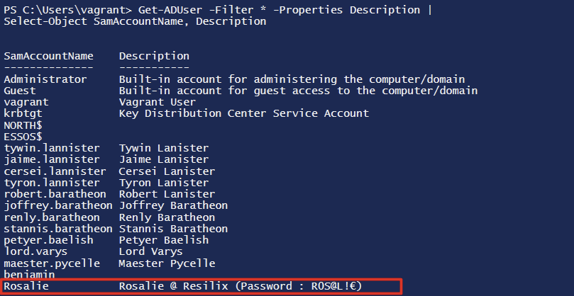 The final screenshot shows that the user description for the account rosalie contains the user’s password, which is set to R0S@L!€.