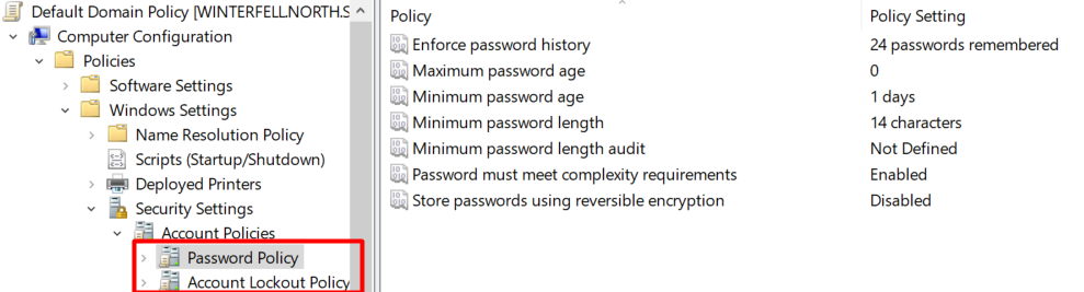 The screenshot below shows the location in Group Policy where the default password policy can be configured. Please note that this is the Default Domain Password Policy. There are also Fine-Grained Password Policies (FGPPs), which allow more specific settings per user or group.