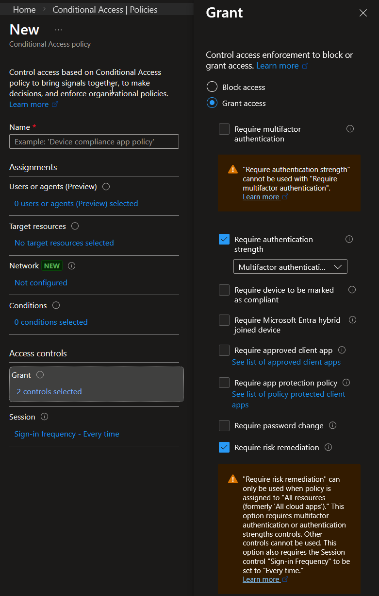 - Enabling "Require risk remediation" will always set the "Require authentication strength" grant control and set the session sign-in frequency to "Every time":