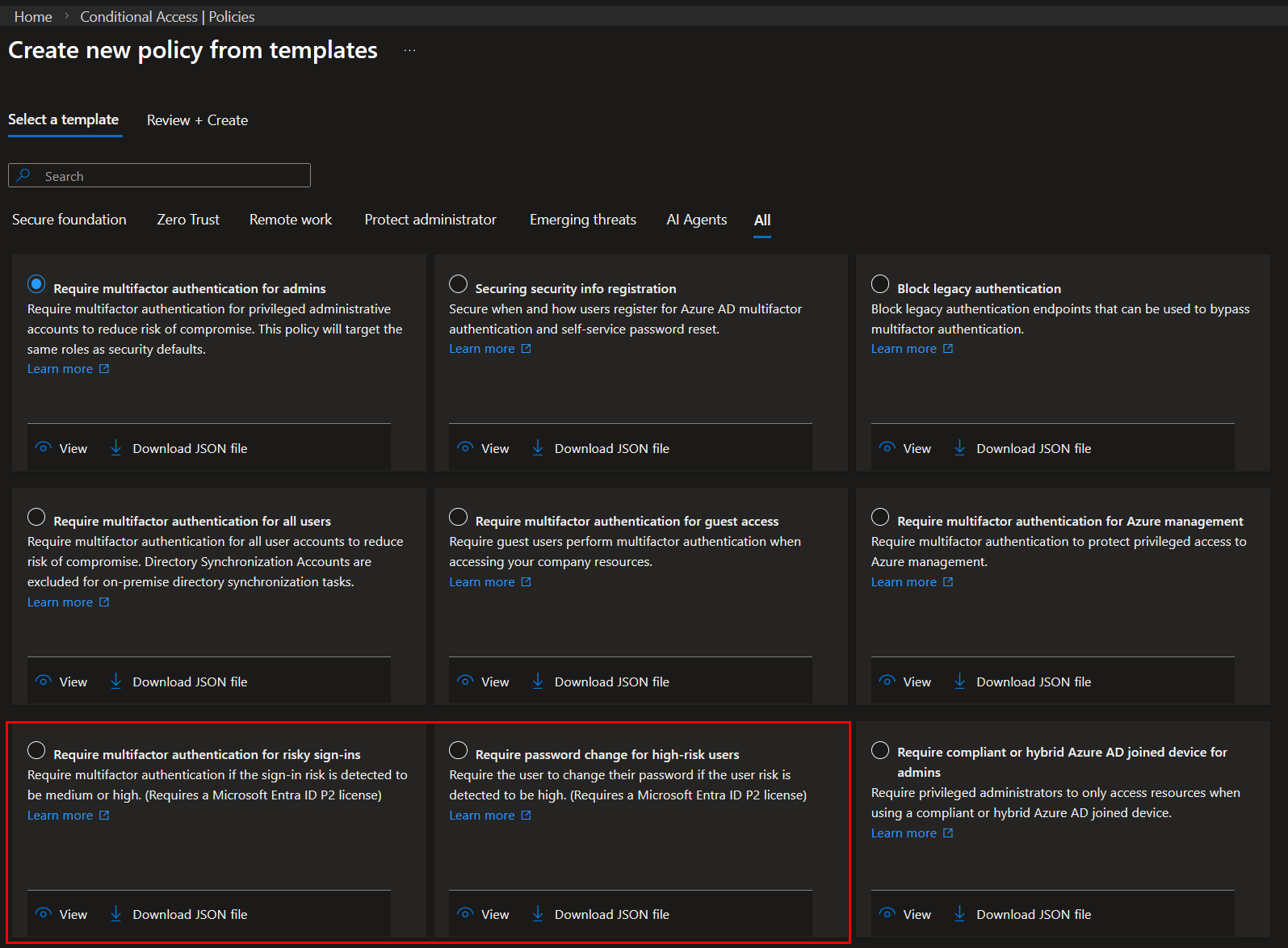 - Template policies: if you have limited time and do not need many customizations, template policies can be used for enforcing MFA for risky sign-ins and requiring password change for high-risk users.