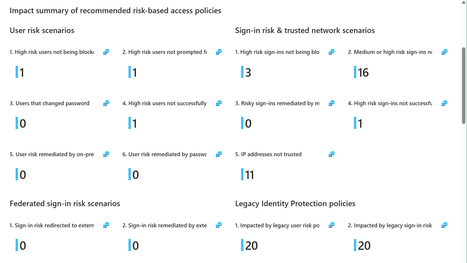 - Review the Risk Policy Impact Analysis workbook in Entra ID Protection: This workbook gives an overview of the potential impact of risk-based Conditional Access policies without the need for having enabled policies or in report-only mode. It also shows users that were not covered by a risk-based policy.